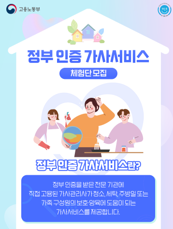 고용노동부에서 맞벌이 가정의 일·가정 양립 지원 등을 위해 정부 인증 가사 서비스 무료 체험 이벤트를 한다고 합니다.