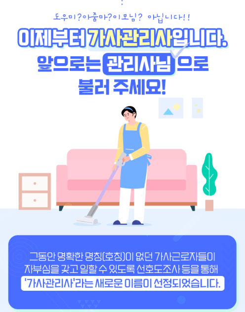 노동부는 최근 가사 근로자 호칭으로 '관리사님'을 사용해 달라고 국민에게 요청했습니다. 관련 업계에서는 가사 근로자의 전문성과 자존감이 반영된 새로운 호칭이 필요하다는 지적이 꾸준히 제기되었고, 그동안 '아줌마', '이모님' 등으로 불리면서 직업적으로 충분히 존중받지 못한다는 인식이 있었기 때문입니다.