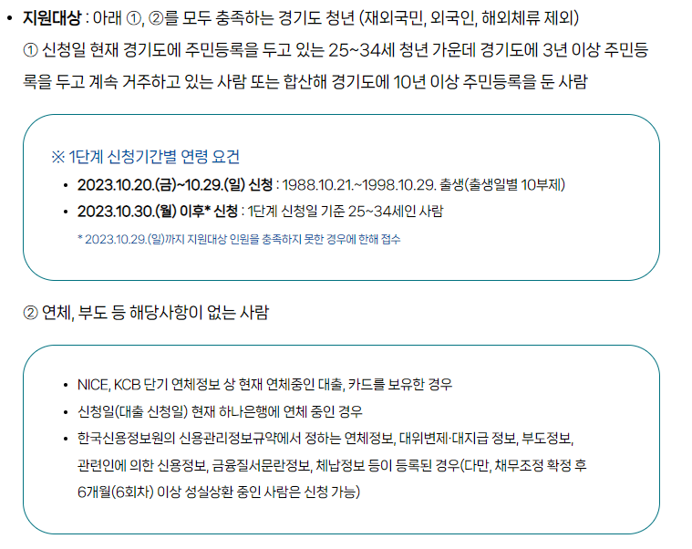 신청은 오는 20일부터 29일까지 출생일자별 10부제 방식으로 선착순 신청접수하며 ▲1단계 경기민원24(gg24.gg.go.kr)에서 온라인으로 신청해 연령과 거주지 요건이 충족된 경우 ▲2단계 다음 영업일부터 하나은행 웹페이지를 통해 연체여부 등 심사 뒤 계좌 개설까지 마치면 이용이 가능합니다. 반드시 1단계 적격통지일 다음날부터 30일 이내에 2단계 신청을 마쳐야 하는 점 유의하시기 바랍니다.