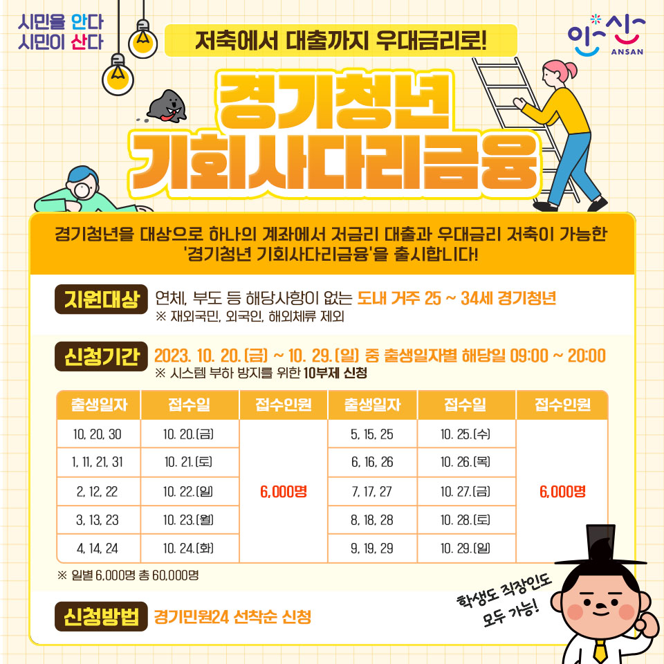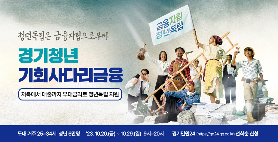 '경기청년 기회사다리금융'은 김동연 지사의 대표 공약 가운데 하나로, 청년들에게 자산·소득에 관계없이 고른 기회를 제공하여 스스로 신용 이력을 쌓아나가 안정적 금융 생활을 할 수 있는 지원 사업입니다. 하나의 계좌에서 저금리 대출과 우대금리 저축을 이용할 수 있게 하여, 잔고가 있으면 시중은행보다 높은 이자를 받고, 마이너스 통장으로 사용해도 낮은 이자로 이용할 수 있다는 장점이 있습니다. 신청일자 별 인원제한이 있으니, 내용 확인하시고 마감 전 신청하시길 바랍니다.