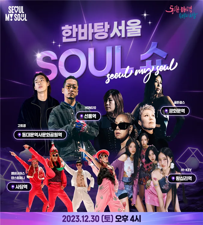 연말을 맞아 서울 시내 5개 지하철 역사에서 동시에 게릴라콘서트가 열립니다. 12월 30일 오후 4시 지하철역 5곳에서 1시간 동안 개최 될 ‘한바탕 서울 소울(Soul) 쇼’는 한 해를 마무리하며, 애써 공연장을 찾지 않아도 도심에서 즐길 수 있는 공간 마련의 취지로 골든걸스, 홍텐, 고퇴경, 하이키, 앰비규어스의 게릴라콘서트입니다. 오며 가며 가까운 지하철역사 안에서 시름을 잠시 잊고 연말 분위기를 즐기며 밝은 새해의 기운을 드리기 위해 특별하고 다양한 무대가 준비되었다고 합니다.