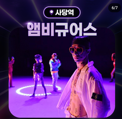 ‘범 내려온다’의 이날치와 함께 전 국민의 어깨를 들썩이게 한 퓨전팝 댄스의 대표주자인 앰비규어스가 시민들의 어깨춤에 다시 한번 시동을 걸기 위해 사당역에 찾아옵니다. 현대무용의 장르와 경계를 넘나들며 퓨전팝 댄스의 한 획을 그은 앰비규어스가 이번에는 지하철역에서 신나는 팝 메들리로 그들만의 바디콘서트로써 시민들을 위한 멋진 무대를 선사할 예정입니다.