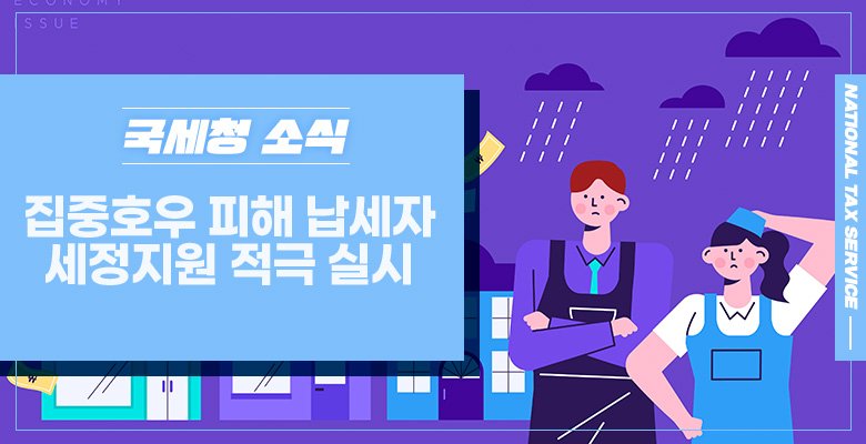 국세청은 이번 집중호우 피해를 입은 납세자에 대해 신고 및 납부 기한연장, 압류·매각 유예, 세무조사 연기 등의 세정지원을 적극 실시한다고 20일 밝혔습니다. 25일에 신청마감이오니, 바로 확인 후 세정지원 혜택을 받으시길 바랍니다.