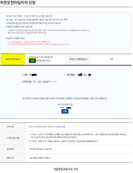 3) 대상자확인 메시지에 "무위반 무사고 서약 가능합니다."라고 나와있으면 신청가능합니다. 파란 "신청" 버튼을 클릭하 시면 신청이 완료됩니다.