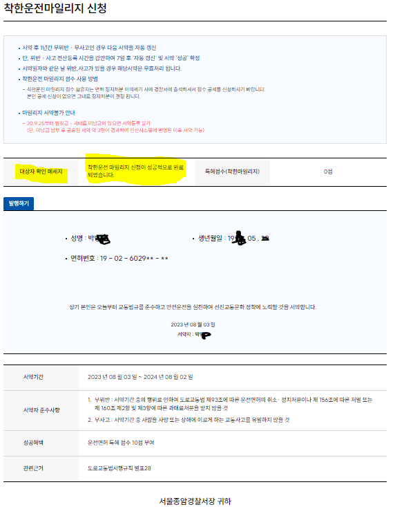 1년간 무위반 무사고를 준수하여 서약에 대한 내용을 지키면 10점의 마일리지를 얻을 수 있습니다.