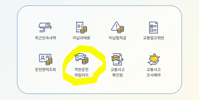 1) 경철청교통민원24(이파인) 접속 후 바로가기 아이콘 중 착한운전 마일리지 아이콘을 눌러 주세요.