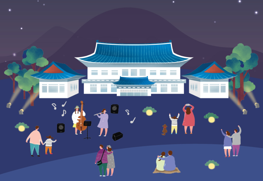 아늑한 숲 소정원, 도심의 야경을 그대로 느낄 수 있는 관저길, 웅장한 반송 옆 녹지원 숲길은 밤이 되면 낮의 소음을 덜어 내고 아름다운 별빛을 머금은 공간으로 재탄생합니다. 잔잔한 공연과 별빛 조명까지, 밤의 청와대에서 일상 속 힐링의 순 간을 맞으시기 바랍니다.