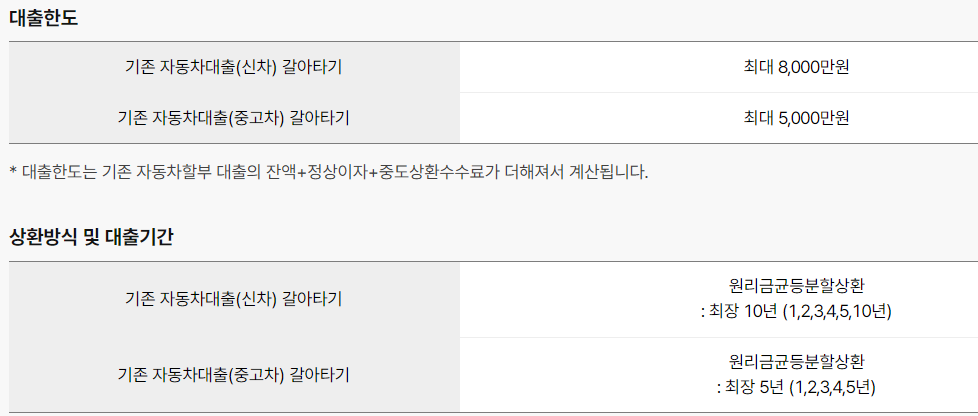 * 제외 대상 : 공동명의, 개인택시, 법인 또는 특수목적 차량, 수입 중고차 - 차량 연수 기준 : 기존 자동차 대출(신차) 갈아타기 =>대출실행일 기준 최초 차량등록일로부터 5년 이내 기존 자동차 대출(중고차) 갈아타기 => 대출실행일 기준 최초 차량등록일로부터 10년 이내