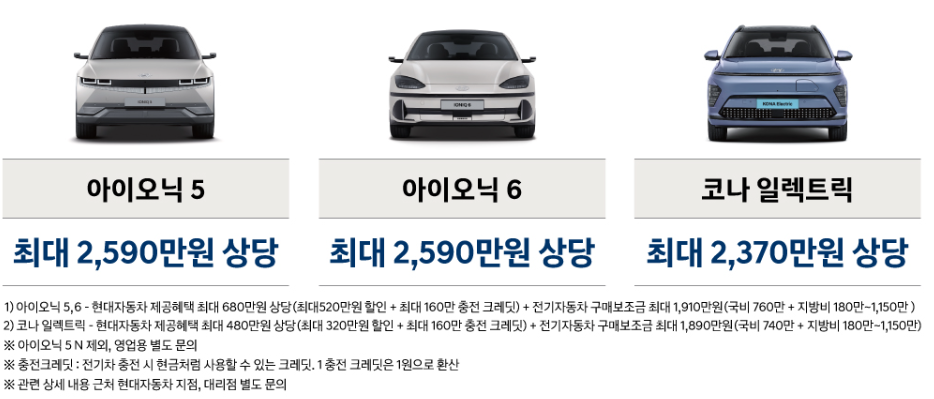 ▷아이오닉 5 최대 600만 원 ▷아이오닉 6 최대 600만원 ▷코나 EVEV 최대 400만 원의 구매 혜택을 제공합니다.