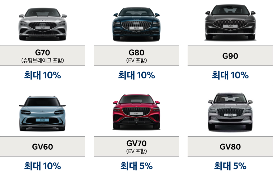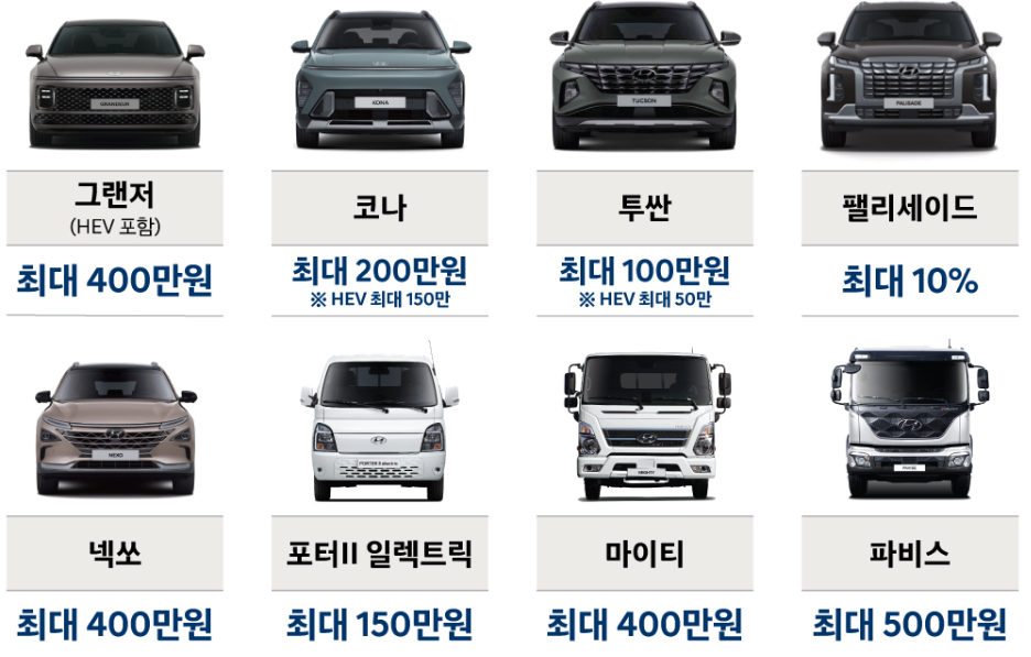 차종별로는 ▷캐스퍼 최대 17% ▷코나 최대 200만 원 ▷팰리세이드 최대 10% ▷그랜저 최대 400만 원 ▷제네시스 G80 최대 10% 할인 혜택을 제공한다. 상용 차량 할인은 ▷파비스 최대 500만 원 ▷마이티 최대 400만 원 등입니다.