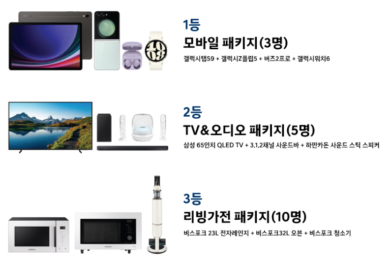 - 경품 : 응모자 중 추첨하여 지급(모바일 패키지, TV&오디오 패키지, 리빙가전 패키지)