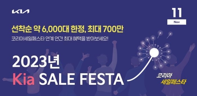 기아자동차가 ‘2023 코리아 세일 페스타’를 맞아 올해 최대 수준의 할인 혜택을 고객들에게 제공한다 고합니다. 11월 1일부터 30일까지 8개 차종에 대한 할인을 선착순 6000대 한정으로 최대 700만 원 할인 행사를 진행한다고 하니, 차량 구매를 준비하고 계신 분들께서는 좋은 혜택으로 구매에 도움이 되길 바랍니다.