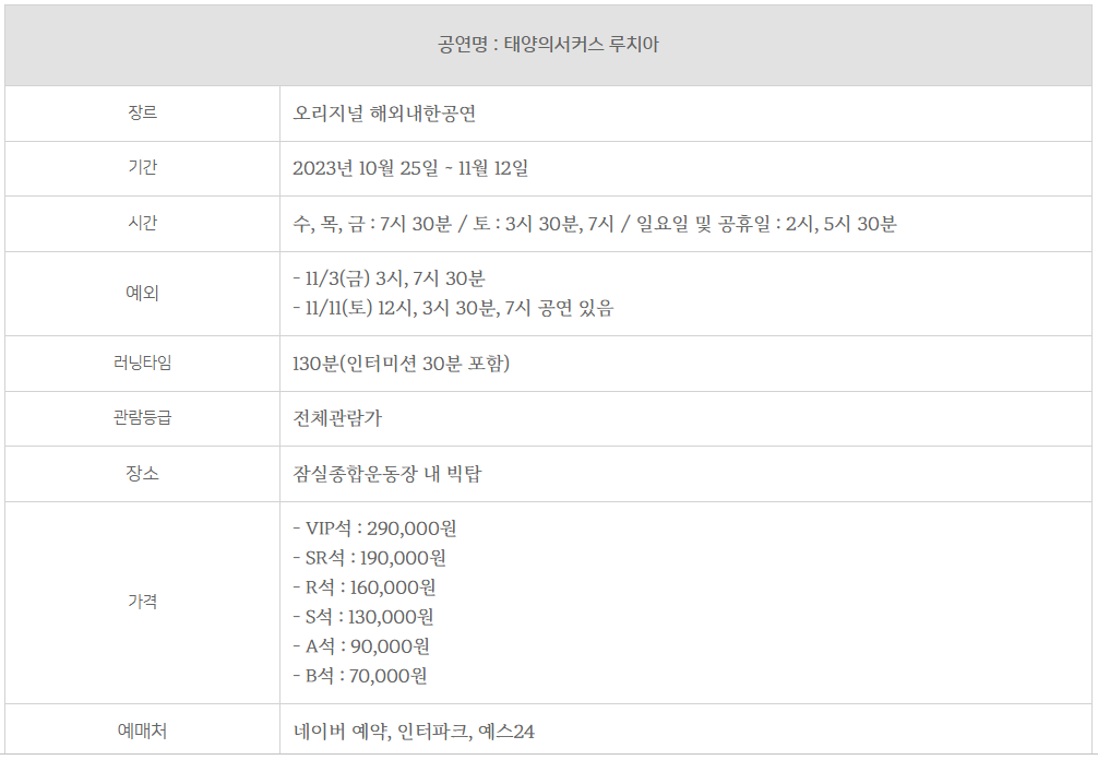 서커스를 예술로 승화한 아트서커스, 90개국과 1,450개의 도시를 거쳐 매번 흥행 열풍을 일으킨 태양의서커스 루치아는 올 가을,겨울 대한민국을 매료시킬 공연이 될 것이라 확신합니다.