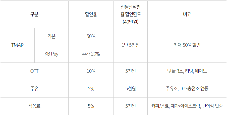티맵을 이용하는 고객을 위한 신용카드로 티맵에서 제공하는 티맵 대리, 주차 등 다양한 모빌리티 관련 서비스 결제 시 기본 할인 30%, KB Pay로 결제 시 추가 할인 20%를 제공해 최대 50% 할인을 월 1만 5000원까지 제공하는 것이 특징입니다.