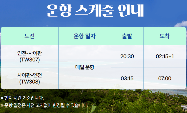 - 운항 정보 : 인천 => 사이판 (TW307 20:30 => 02:15) 사이판 => 인천 (TW308 03:15 => 07:00)