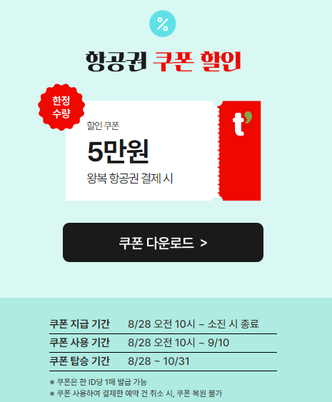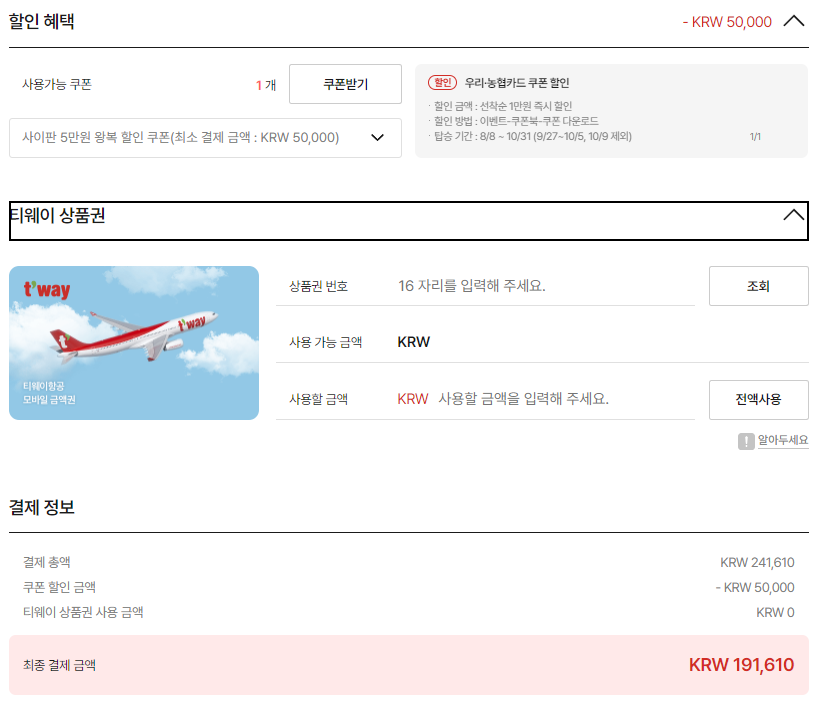 ex) 9월 17일 ~ 22일 (5박) 성인 1인 왕복 항공료 최종 241,610 원. 결제 최종 단계에서 다운 받은 5만원 쿠폰 적용 시 191,610원 최종 결제 요금 확정 됨.