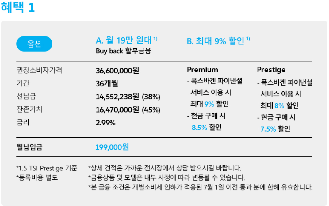 월 납부금 부담을 최소화한 잔가 보장형 할부금융상품도 이용할 수 있으며, 1.5 TSI 프레스티지 기준 선납금 38% 납부 후 36개월 동안 19만 9000원을 내면 되고, 36개월 운행 후에도 최대 45%의 잔존가치가 보장됩니다.