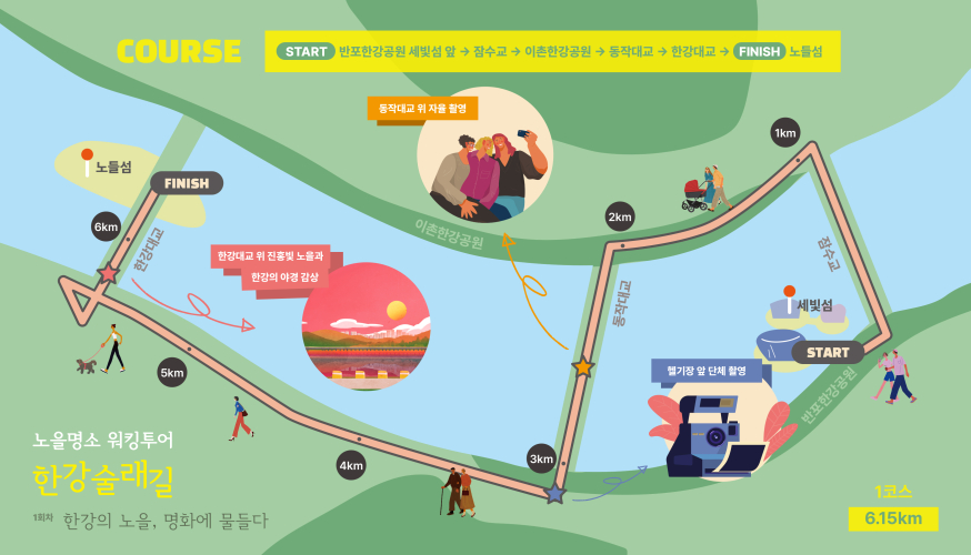 - 이동경로 : 반포 세빛섬 ~ 잠수교 ~ 이촌한강공원 ~ 동작대교 ~ 벚꽃테라스 ~ 한강대교 ~ 노들섬