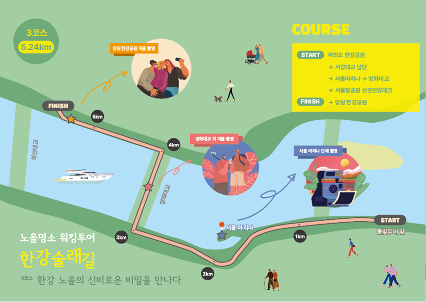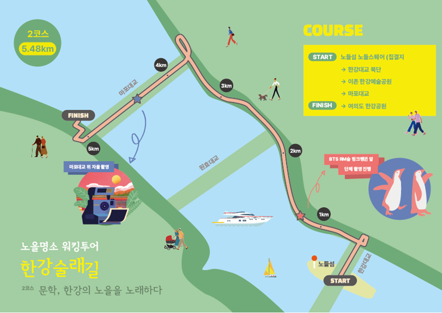 - 이동경로 : 노들섬 서쪽광장 ~ 한강대교 북단 ~ 이촌 한강예술공원 마포대교 ~ 여의도 물빛광장