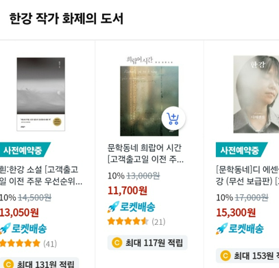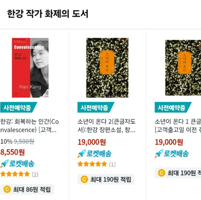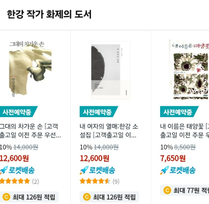 아시아 첫 여성 노벨문학상을 수상한 한강 작가의 관심과 문학에 대해 전 세계에서 관심이 폭주하고 있습니다. 한강 작가의 도서 구매도 서점과 인터넷에서 불티나게 팔려 구매하기가 어렵습니다. 한강 작가의 도서 18종을 사전예약으로 구매가 가능하며 선착순 마감 전 빠르게 사전예약을 추천드립니다.