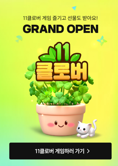 출석체크와 친구초대, 상품구매 등 미션을 수행해 얻은 물을 줘 클로버 잎 11개를 모두 키우면 경품을 받을 수 있는 앱테 크형 게임 이벤트입니다. 경품은 하동녹차 명란김, 6년근 홍삼정 프리미엄, 캡형 아기 물티슈 등 11번가 MD가 엄선한 인 기식품과 생필품 6종 중 선택할 수 있으며,이벤트는 12월 말까지로 11개 클로버 잎을 모두 모은 고객 중 100명을 추첨해 순금클로버 0.5돈을 선물한다고 합니다.