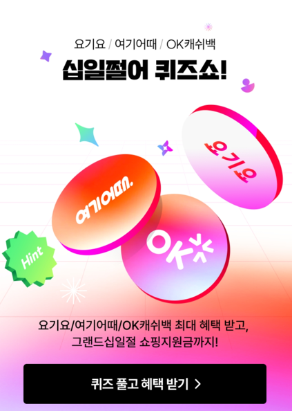 퀴즈를 풀고 요기요(매일1+1 / 10%할인쿠폰), 여기어때(최대2만원 11%할인쿠폰), OK 캐쉬백(11,000P적립) 등의 혜택을 받을 수 있습니다.