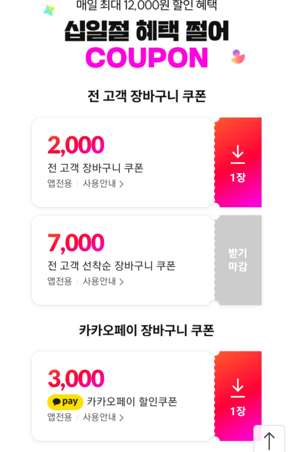 - 10일까지 모든 고객에게 매일 7000원 장바구니 할인쿠폰(7만원 이상 구매시, 선착순 발급), 2000원 장바구니 할인쿠폰(2만원 이상 구매시) 등 2종을 발급하며 11일엔 쿠폰 혜택 폭을 더 넓힌다고 합니다.