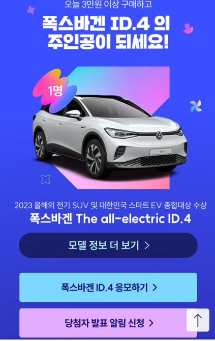 1) 폭스바겐 ID.4 경품 응모 : 3만원 이상 구매시 응모의 기회가 주어집니다.