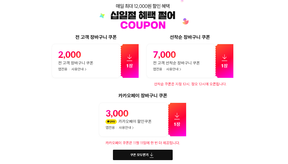 11월을 대표하는 연중 최대 축제인 ‘그랜드 십일절’의 위상에 걸맞은 화려한 피날레 행사를 11월 11일 2023 십일절에 준비하고 있다고 합니다. 역대급 규모와 혜택으로 꽉 채운 십일절로 많은 분들께 마지막까지 큰 즐거움과 끝판 할인에 최고의 쇼핑 득템에 성공하시길 바랍니다.