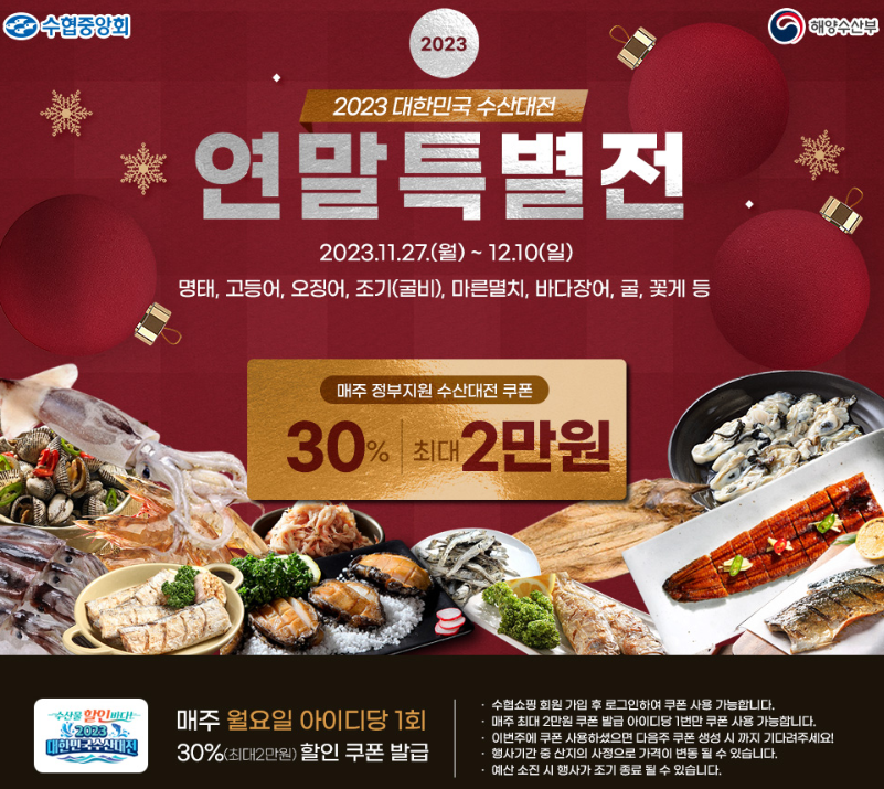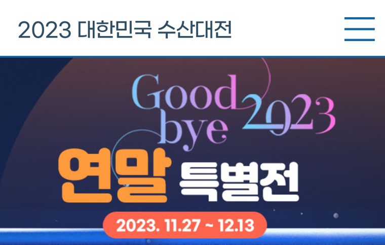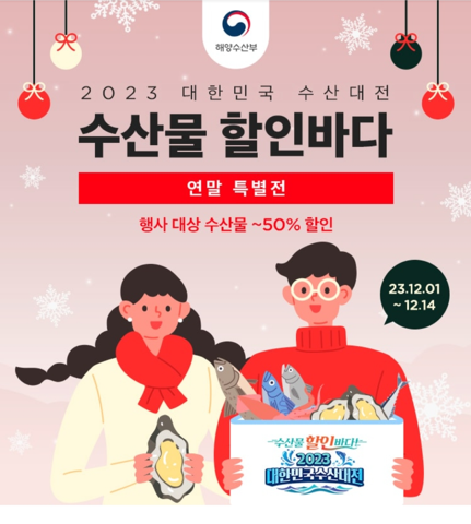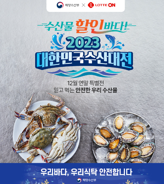 이번 2023 대한민국 수산대전 연말특별전은 올해 마지막 행사로 이번 행사를 통해 좋은 가격에 우리 수산물을 구매하셔서 가족, 지인과 함께 즐기며 올 한 해를 기분 좋게 마무리하시길 바라며 또한 국내산 수산물의 소비가 활성화되면서, 연말과 각종 수산물 철에 안전하고 신선한 우리 수산물 할인의 혜택이 내년에도 더욱 풍성해지기를 바랍니다.