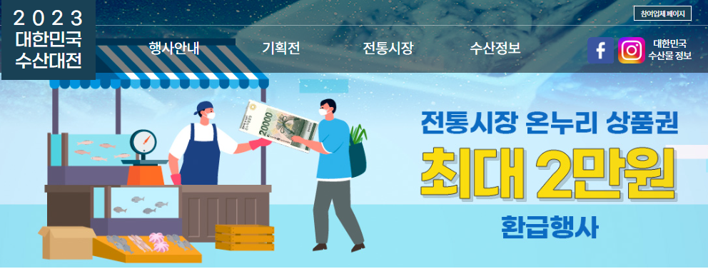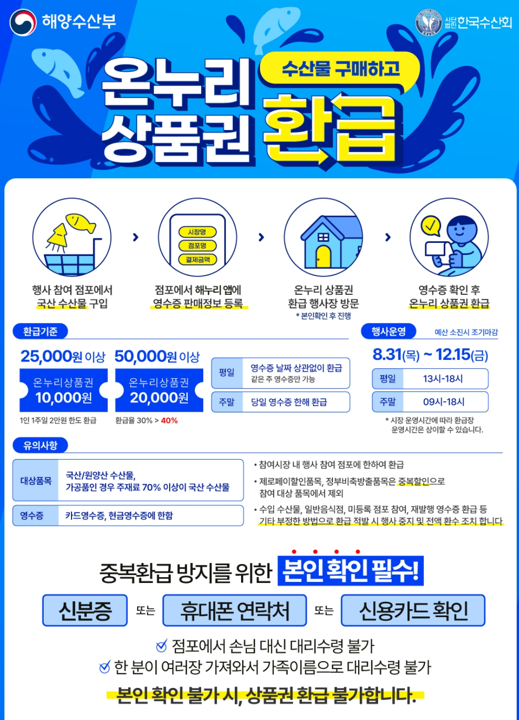 행사 참여 점포에서 국산 수산물 구입 시 25,000원 이상 1만 원, 50,000원 이상 2만 원 온누리 상품권 환급지급합니다.