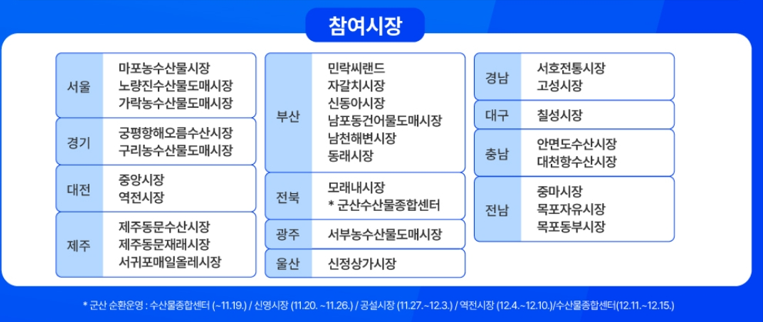 해양수산부 주관 ‘대한민국 수산대전-연말 특별전’이 12월 13일까지 전국 대형마트, 전통시장과 온라인몰에서 국내산 수산물을 최대 60% 할인의 혜택으로 구입할 수 있는 행사가 진행 중입니다. 이번 특별전에서는 대중성 어종인 명태, 고등어, 오징어, 참조기, 마른 멸치, 바닷장어, 굴 등이 할인 판매되며, 특히 전통시장에서 구입 시 25,000원 이상 구입 시 1만 원, 50,000원 이상 구입 시 2만 원의 온누리 상품권 환급도 받을 수 있으니, 자세한 정보 참조하시기 바랍니다.
