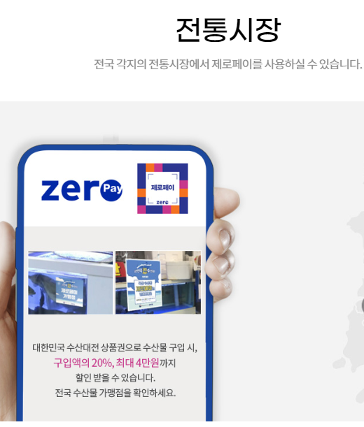 - 수산물 전용 제로페이 모바일상품권 종류 : 1만 원 권, 5만 원권, 20만 원권 등 3가지.(20% 할인된 가격인, 20만 원권은 16만 원, 5만 원 권은 4만 원, 1만 원권은 8000원에 구매 가능)
