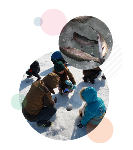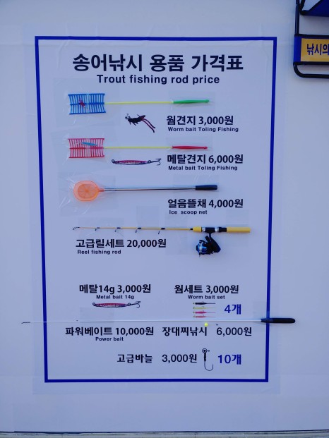 - 참고사항 : 1인 얼음구멍 1개 제공. 현장 낚시판매점에서 낚시도구를 구입할 수 있으며, 잡으신 송어는 먹거리촌에서 회와 구이로 드실 수 있는 모든 편의를 제공(회, 구이 손질비용 4,000원)