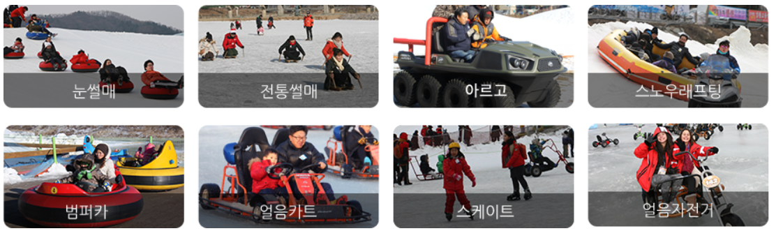 겨울레포츠 : 눈썰매, 전통썰매, 아르고, 스노래프팅, 범퍼카, 얼음카트, 스케이트, 얼음자전거