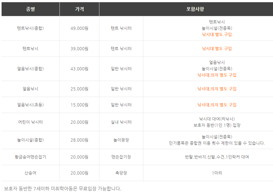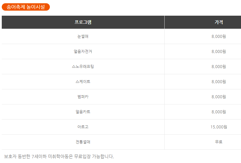 - 요금 : 얼음종합(얼음낚시 + 놀이종합) 성인 43,000원 /일반(중학생이상) 25,000원/ 학생(초등학생할인) 15,000원(미취 학 아동의 경우 보호자 동반 시 무료입장이 가능)
