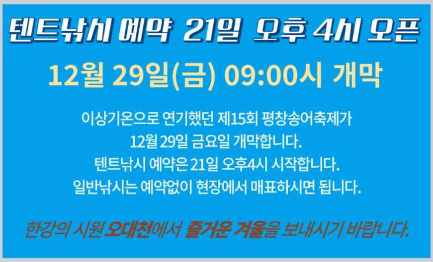 - 장소 : 강원도 평창군 진부면 오대천 평창송어축제장(경강로 3562번지)