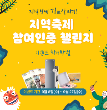 - 참여방법 : 동행축제 기(氣)UP 챌린지 또는 가져가 챌린지 중 선택하여 필수 해시태그와 함께 SNS에 영상을 올려주세요!
