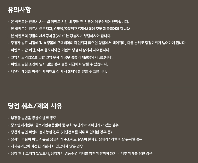 - 결과 발표 : 당첨 대상자 개별 연락하여 구매내역 확인 후 당첨건 부합 시 공개 예정