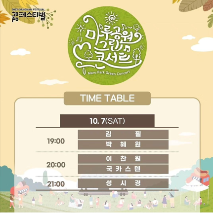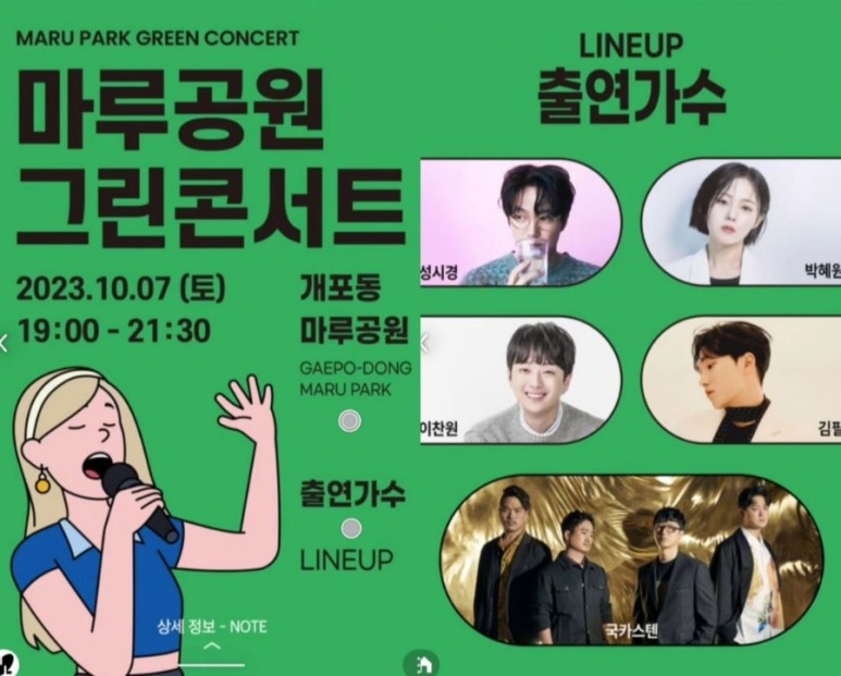 개포동 마루공원에서 열리는 마루공원 그린콘서트는 그중 가을밤의 라이브 콘서트로, 그 분위기를 물씬 느끼실 수 있는 무료입장 콘서트입니다. 라인업 가수로는 이찬원, 성시경, 박혜원, 국카스텐, 김필 등이 2023 강남페스티벌 축제의 분위기를 무르익힐 예정입니다.