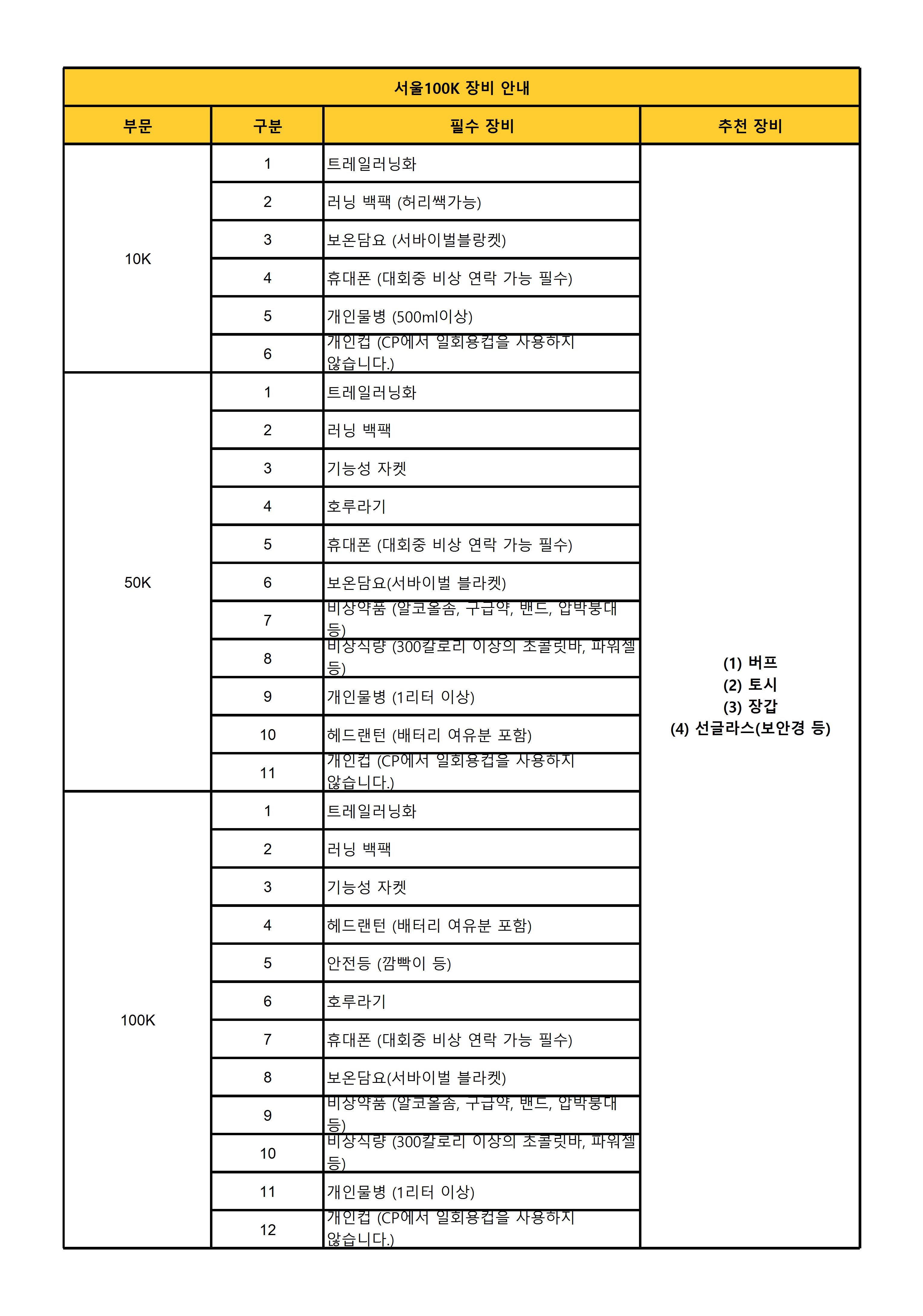 *10K & 50K & 100K 참가자는 레이스 도중 필수장비 검사를 실시하며, 필수장비가 없는 경우 패널티 또는 실격처리 됩니다.
