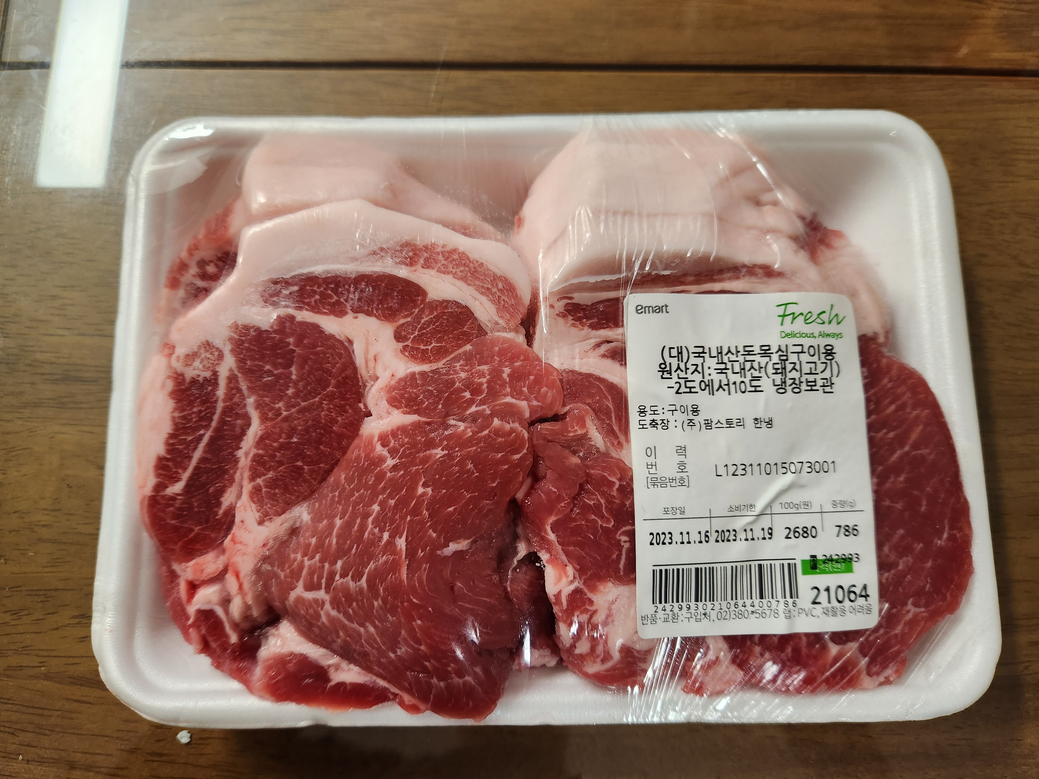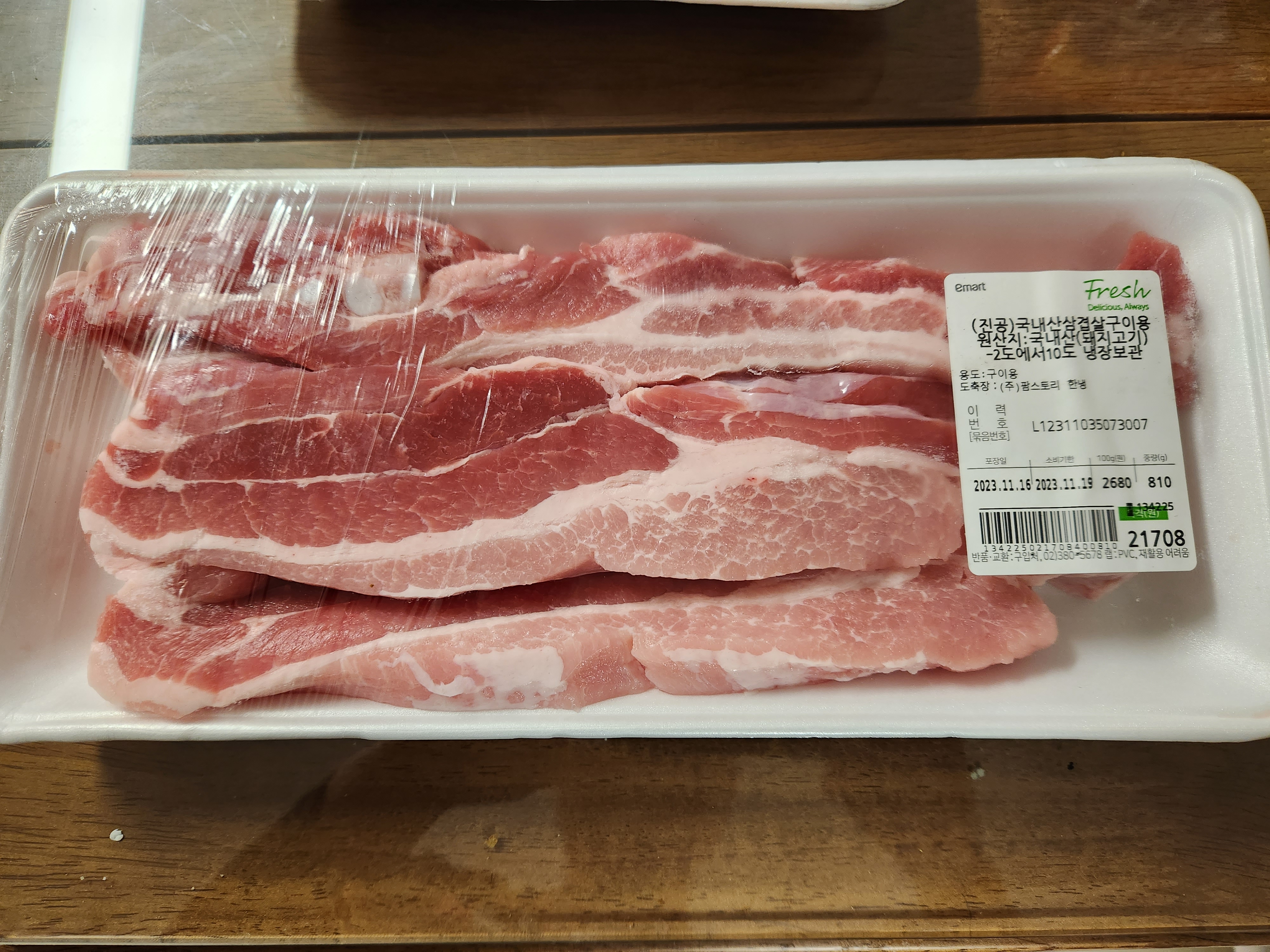 지하에 육류 코너로 직행을 하였고, 전단에 나와 있는 '1등급 이상 돈 삼겹/목심' 코너로 곧장가서 행사 해당 품목인지 확인 후 삼겹살과 목살의 가격, 중량 그리고 할인을 확인하고 삼겹살과 목살 각 800g 두팩을 집었습니다. 주위에 많은 사람들이 모여들어 서로 집느라 분주하고 열기가 어마어마하였는데, 제것을 바구니에 담고 나니, 어느새 냉장실에 물건이 동이나 버리더군요. 물론 오픈 전 세팅한 초기 물건이 금새 빠진 것이라, 그 후 추가 물건을 보충하면서 구매를 위해 줄을 스는 관경이 펼쳐 졌습니다. 1등급 이상 삼겹살과 목살이라 육안으로 보아도 고기가 매우 좋아 보이며, 비계도 별로 없는 편이라 800g 두팩을 21,000원에 구매를 하게되어 완전 득템, 기분이 좋았습니다.