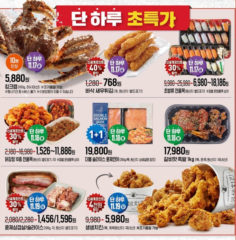 11) 바삭 새우튀김 40% 할인, 초밥류 전품목 30% 할인