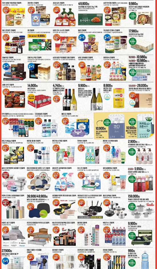 6) 냉동 얇은 피 만두, 시리얼, 냉동 핫도그, 치즈/수입버터, 삼진어묵, 고추장/된장/쌈장 키틴차월, 주방세제, 헤어염모제, 하 흠집/마미포코/페넬로페 기저귀 전품목 2개 이상 구매 시 50% 할인