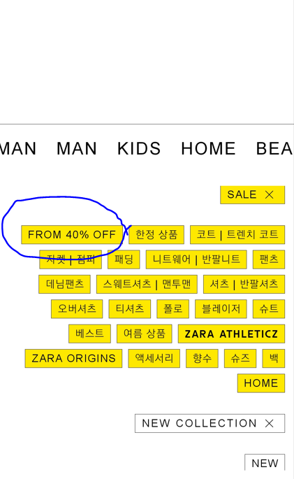 - 자라세일은 세일 시작일을 사전에 인지하고, 온라인 어플과 공홈에서 미리 세일 품목과 가격을 확인하실 수 있는 장점이 있습니다. 인기제품들은 매번 세일 시작과 동시에 빠르게 품절이 이루어지기때문에 미리 본인의 쇼핑 기호에 맞게 제품군 또는 할인율 등을 기준 삼아 눈여본 상품들을 장바구니에 미리 담아 두고 세일 시작과 함께 결제를 진행하시는 것을 추천드립니다. 메인 페이지 노란색 카테고리 박스 중 "From 40% OFF"를 클릭하시면 최대 할인율 60% 상품부터 확인을 하실 수 있습니다. 또한 하부 카테고리 제품군별로 클릭하시면 할인율에 따른 제품들을 확이하실 수 있으니 참고하시기 바랍니다.