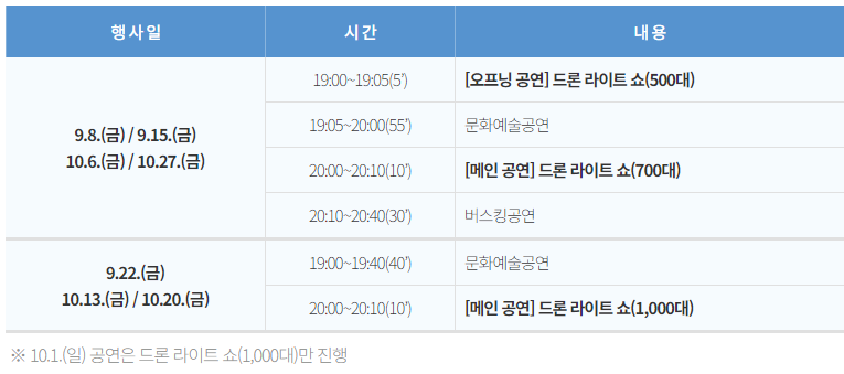 추석연휴를 고려하여 10월 1일 한차례 더 진행이 되어 10월 첫째 주에는 두 차례 뚝섬한강공원 드론쇼를 진행을 합니다. 다만 추석연휴 기간인 10월 1일 드론쇼는 문화예술공연 없이 드론쇼만 진행한다고 참고 바랍니다.