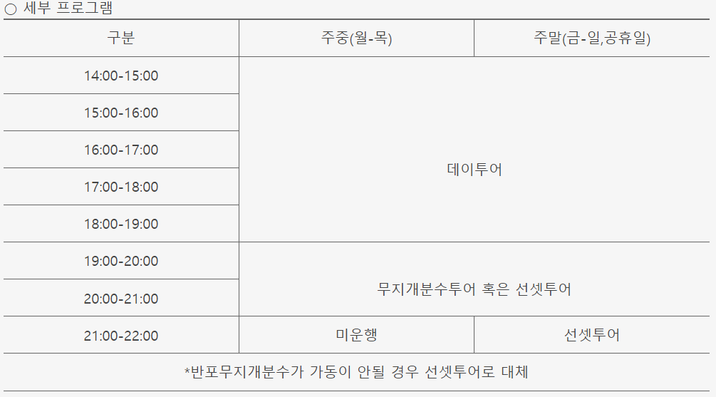 데이투어, 선셋, 무지개분수쇼, 야경까지 한강 한가운데서 낭만을 제대로 즐기 실 수 있습니다.