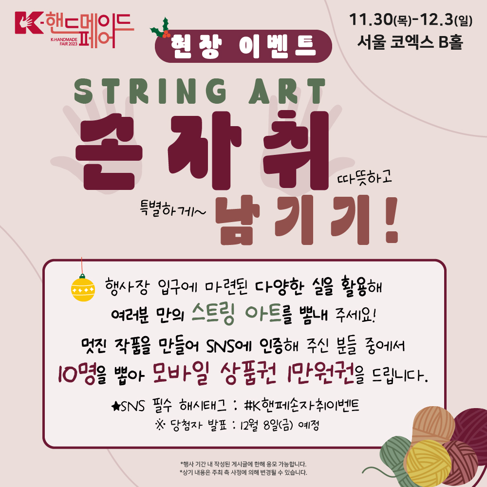 어른부터 아이까지 힐링이 필요한 모든 이들을 위한 '겨울방학 특별활동'을 주제로 개최되는 'K-핸드메이드페어 2023'이 11월 30일(목)부터 12월 3일(일)까지 4일간 코엑스에서 열립니다. 각종 트렌디한 핸드메이드 완제품뿐 만 아니라, DIY KIT, 각종 부자재/재료를 한 자리에서 만나볼 수 있고, 공예 체험을 해볼 수 있는 공간도 마련될 예정이며, 다채로운 이벤트는 물론, 색다른 볼거리와 즐길거리로 가득한 전시회는 아이부터 어른까지 체험과 흥미로 열기가 가득할 예정입니다. 사전 관람 신청 시 입장료 20% 할인 가능하다고 하니, 기간 내 서둘러 사전관람 신청하시기 바랍니다.