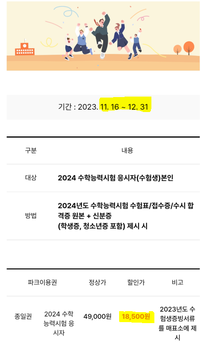 2)에버랜드: 11월 17일부터 12월 31일까지 2024학년도 수능생, 입시 준비자, 수시 합격자를 대상으로 '2024 수능생 특별 우대' 이벤트를 진행하고 있습니다. 대상자의 경우 현장 매표소에서 수험생 증빙서류를 제시하면 정상가 62,000원 자유이용권을 할인우대가 19,000원에 이용하실 수 있습니다. 동반 1인에 한해 이용료 일부를 할인해주고 있습니다.