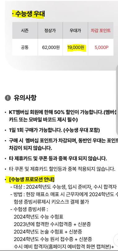 2)에버랜드: 11월 17일부터 12월 31일까지 2024학년도 수능생, 입시 준비자, 수시 합격자를 대상으로 '2024 수능생 특별 우대' 이벤트를 진행하고 있습니다. 대상자의 경우 현장 매표소에서 수험생 증빙서류를 제시하면 정상가 62,000원 자유이용권을 할인우대가 19,000원에 이용하실 수 있습니다. 동반 1인에 한해 이용료 일부를 할인해주고 있습니다.